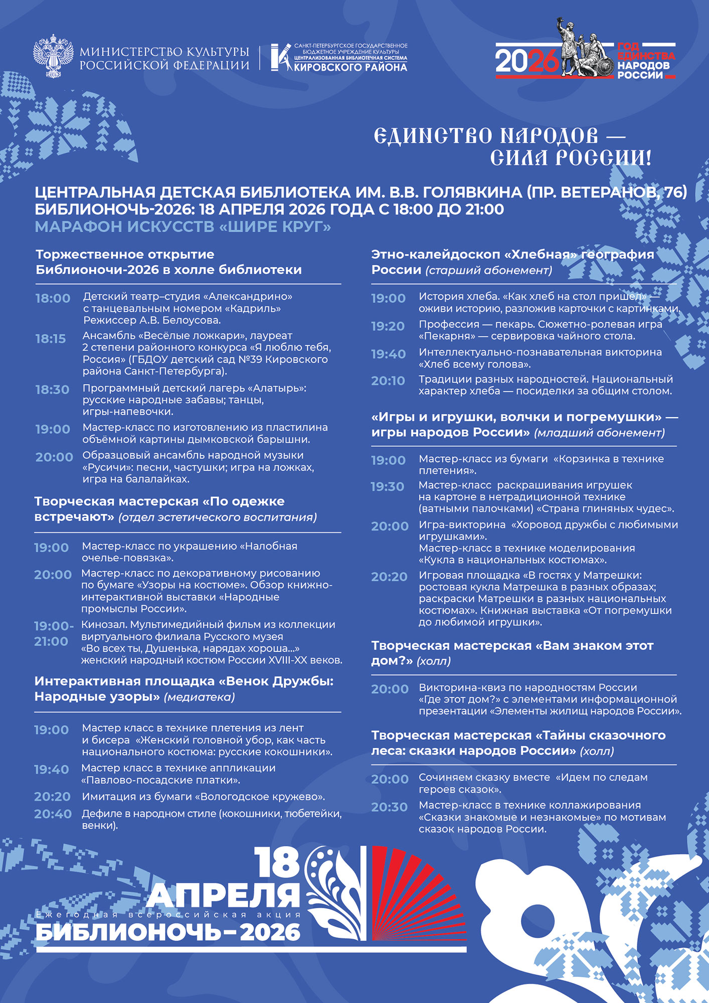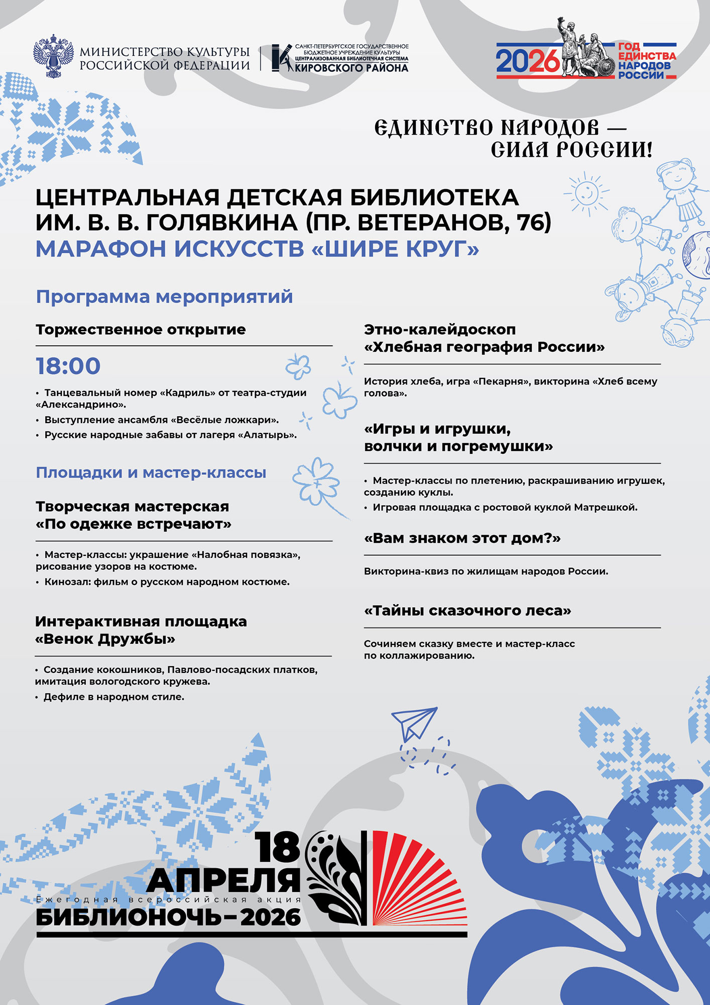 18 апреля в 18.00 Централизованная библиотечная система Кировского района присоединится к юбилейной, 15-й Всероссийской акции "Библионочь 2026". В этом году акция посвящена Году единства народов России и проходит под лозунгом: "Единство народов - сила России". Основными площадками масштабного события станут Библиотека № 4 (Библиотечно-культурный комплекс имени) А. В. Молчанова (Ленинский пр., д. 115) и Центральная детская библиотека имени В. В. Голявкина (пр. Ветеранов, д. 76).